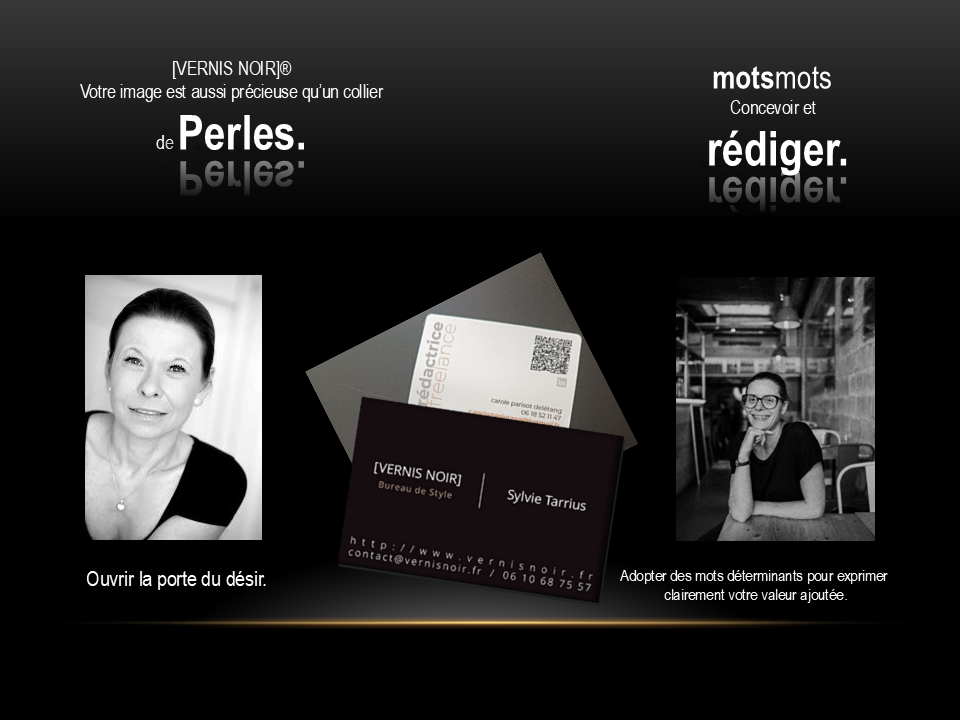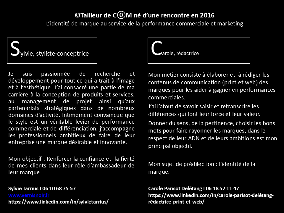 L’entité ©Tailleur de COM a été créée en Novembre 2016 par Sylvie Tarrius, styliste-conceptrice, créatrice de [VERNIS NOIR] et Carole Parisot-Delétang, rédactrice.